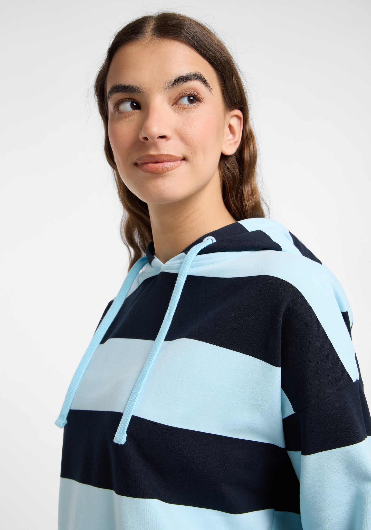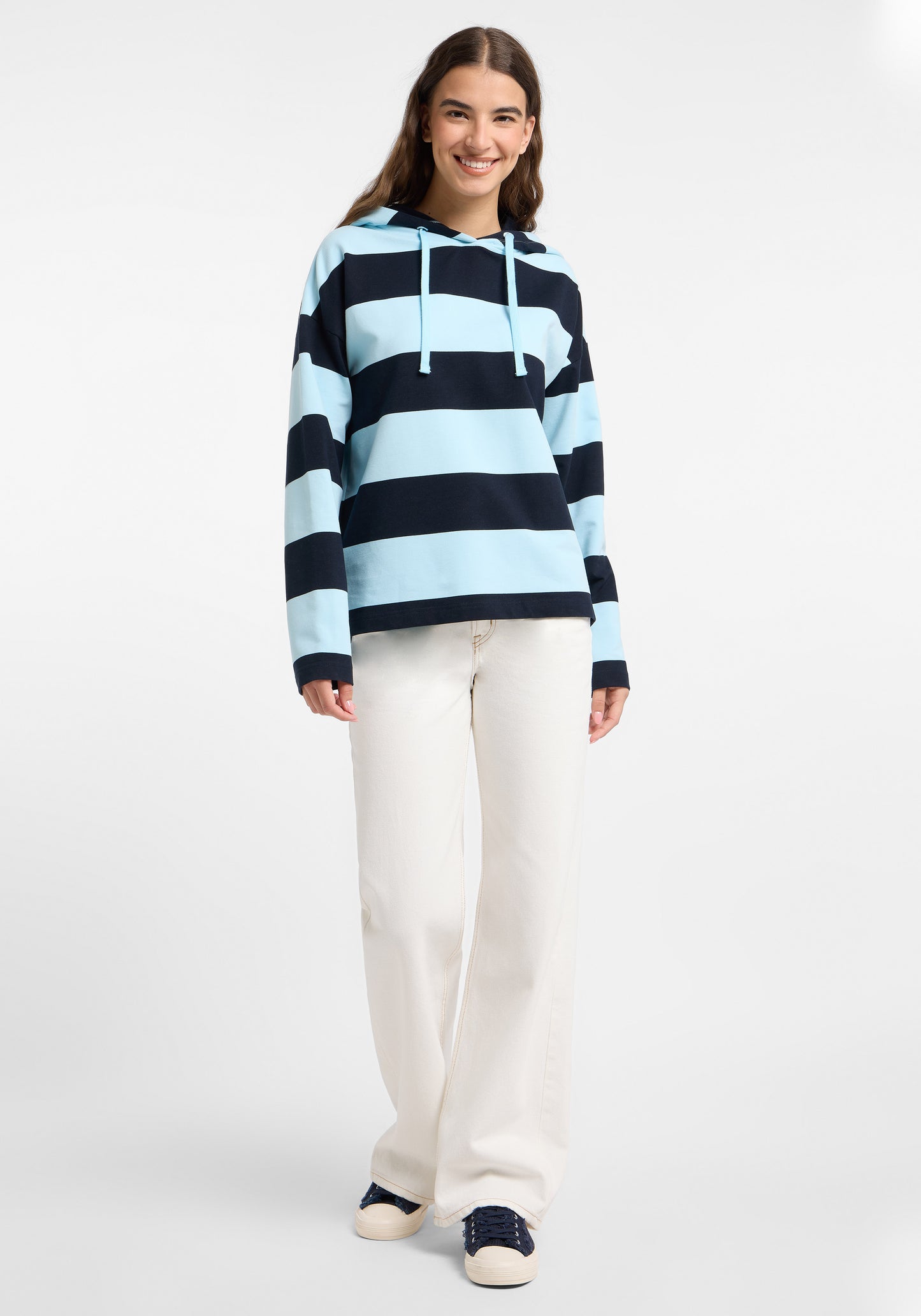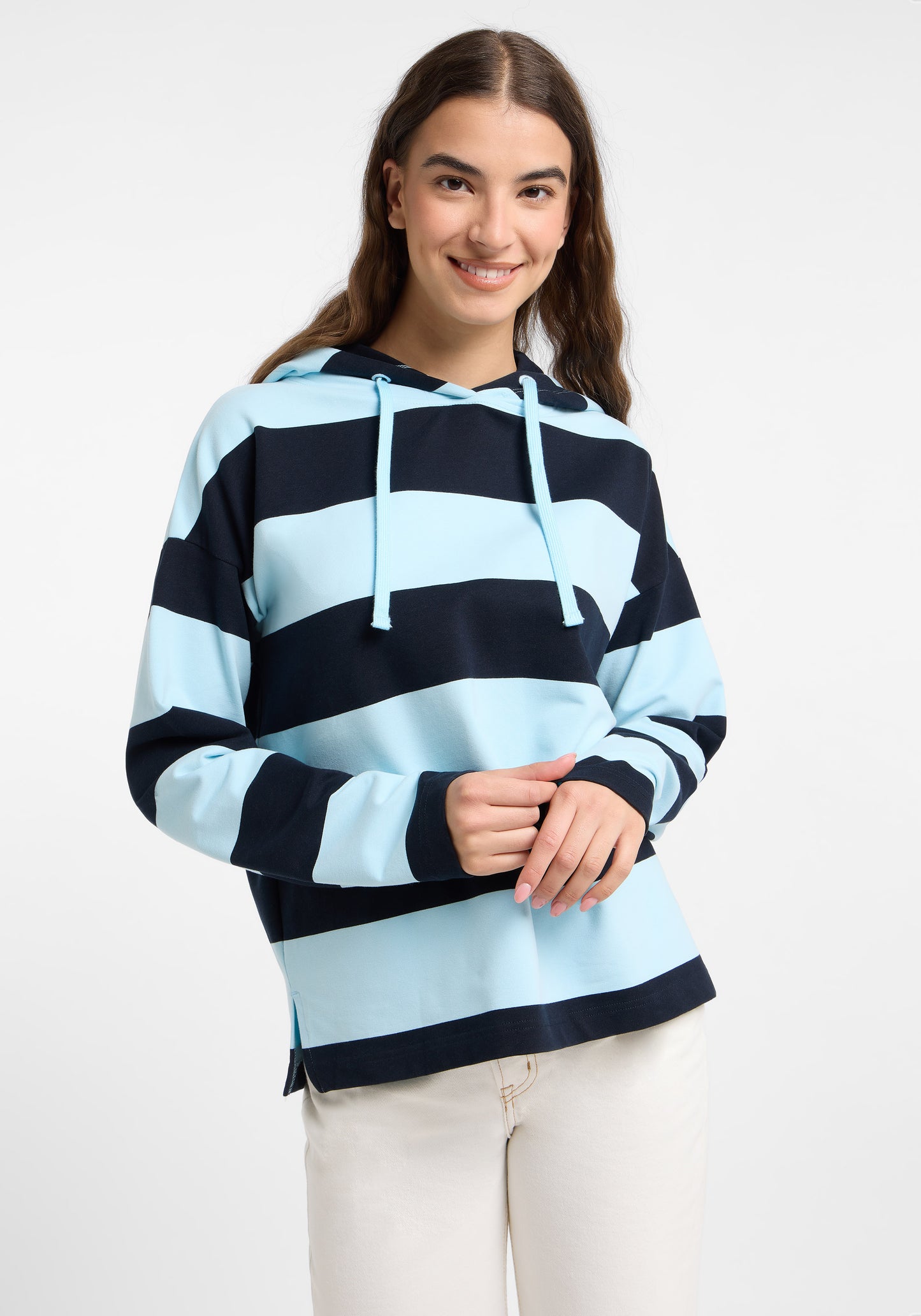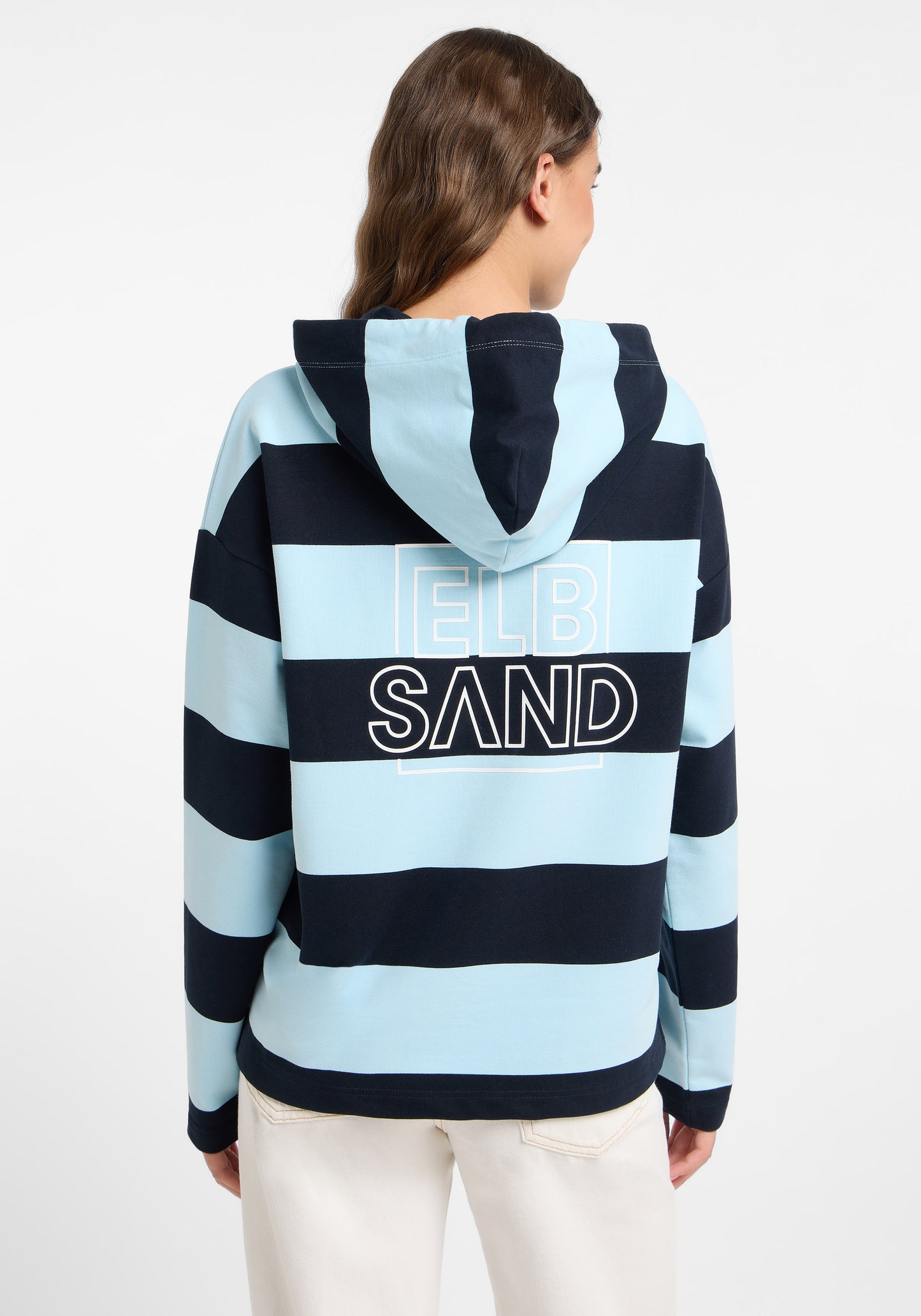Notre sweat à capuche Elbsand Eydis offre un style confortable à coupe ample avec un tissu sweat doux et élastique, orné d’un motif à rayures moderne. Le sweat dispose d’une capuche avec cordon ton sur ton, d’épaules tombantes, de manches droites et d’une impression en caoutchouc douce et stylée dans le dos. Parfaitement combinable avec un jean, un chino ou une jupe culotte, ce sweat à rayures est idéal pour les femmes recherchant un sweat moderne, confortable et élégant. La composition du matériau est de 95 % coton et 5 % élasthanne. Les instructions d’entretien recommandent un lavage en machine à 30 degrés en cycle délicat, sans utilisation de sèche-linge.