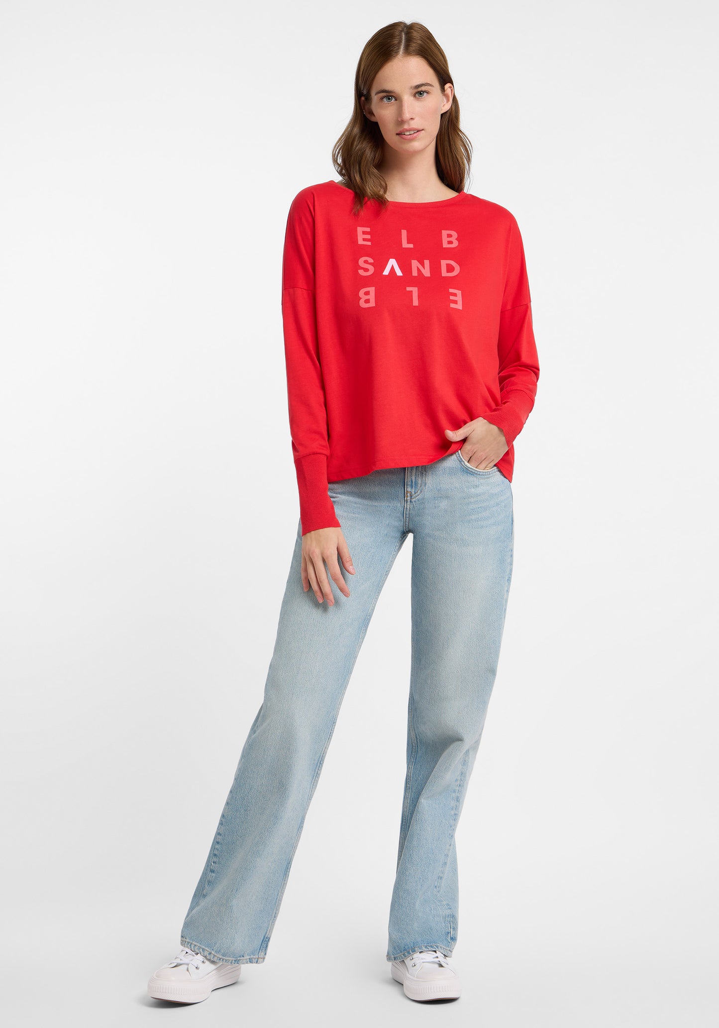 Le T-shirt manches longues Elbsand Ingiara est coupé de manière ample et fabriqué en jersey simple léger avec une texture douce au toucher. Il possède une encolure bateau confortable et des bordures de manches en côtes élastiques pour un confort supplémentaire. Un imprimé flocké semi-transparent sur le devant donne un look unique au t-shirt. Ce manches longues se combine parfaitement avec un jean et offre un style décontracté et sportif. Le t-shirt est composé de 50 % coton et 50 % polyester, avec des manches longues dotées de larges bord-côtes et un logo imprimé à l'avant et à l'encolure. Il est idéal pour les femmes, représentant un design moderne et un confort de port de haute qualité dans un style intemporel.