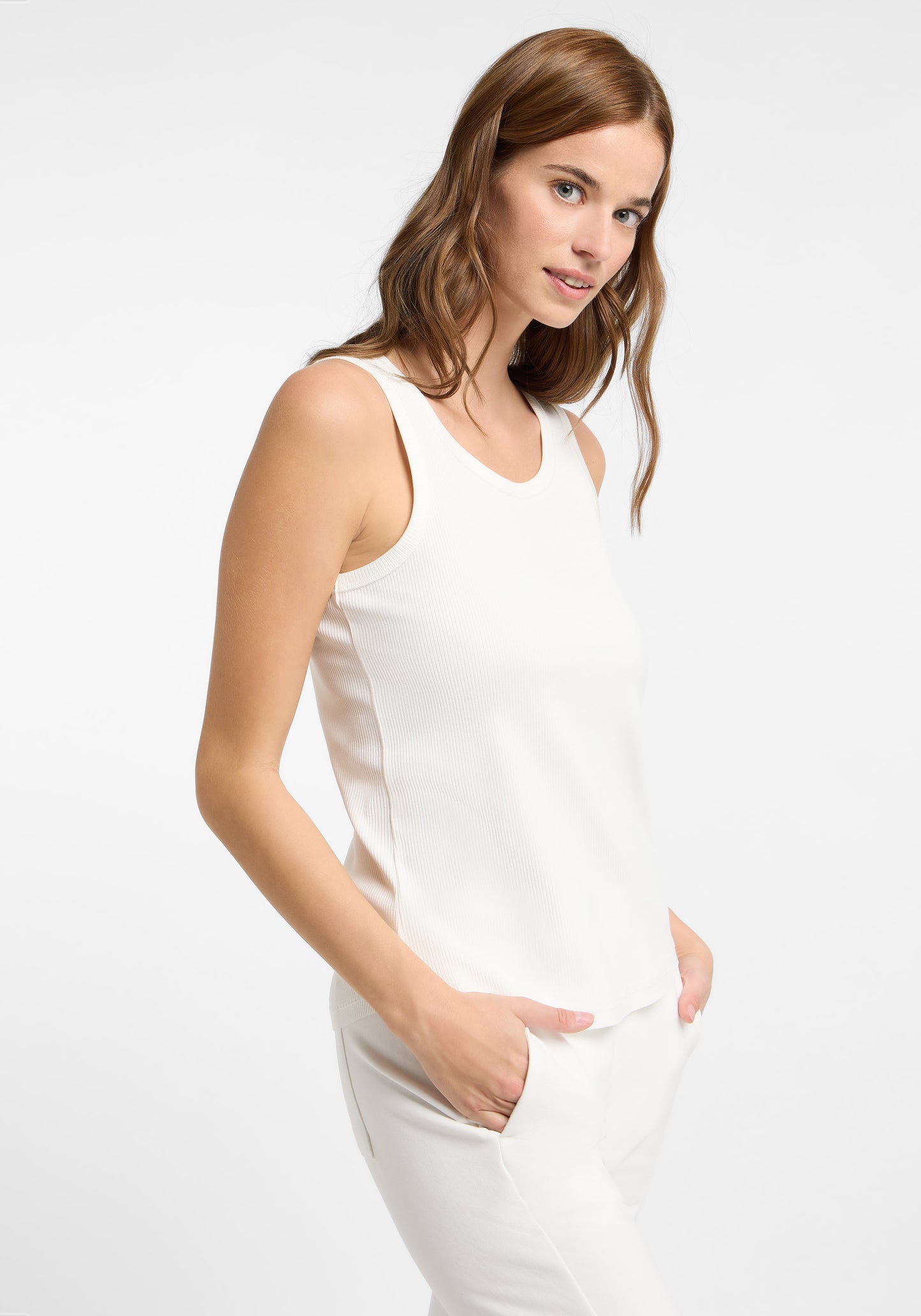 Le Top Jara d'Elbsand est un débardeur à coupe régulière, taillé normalement dans un jersey côtelé doux qui est agréable au contact de la peau et reste stable dans sa forme. Il présente un col rond et un discret logo imprimé doux sur le dos, ajoutant une touche de marque raffinée à ce basique haut de gamme. Polyvalent, ce top convient parfaitement pour un usage quotidien – que ce soit sous une blouse, avec un pantalon de jogging ou seul lors des journées chaudes. Composition : 50% modal, 46% coton, 4% élasthanne. Conseils d'entretien : lavage en machine à 30 degrés cycle délicat, ne pas sécher en machine.